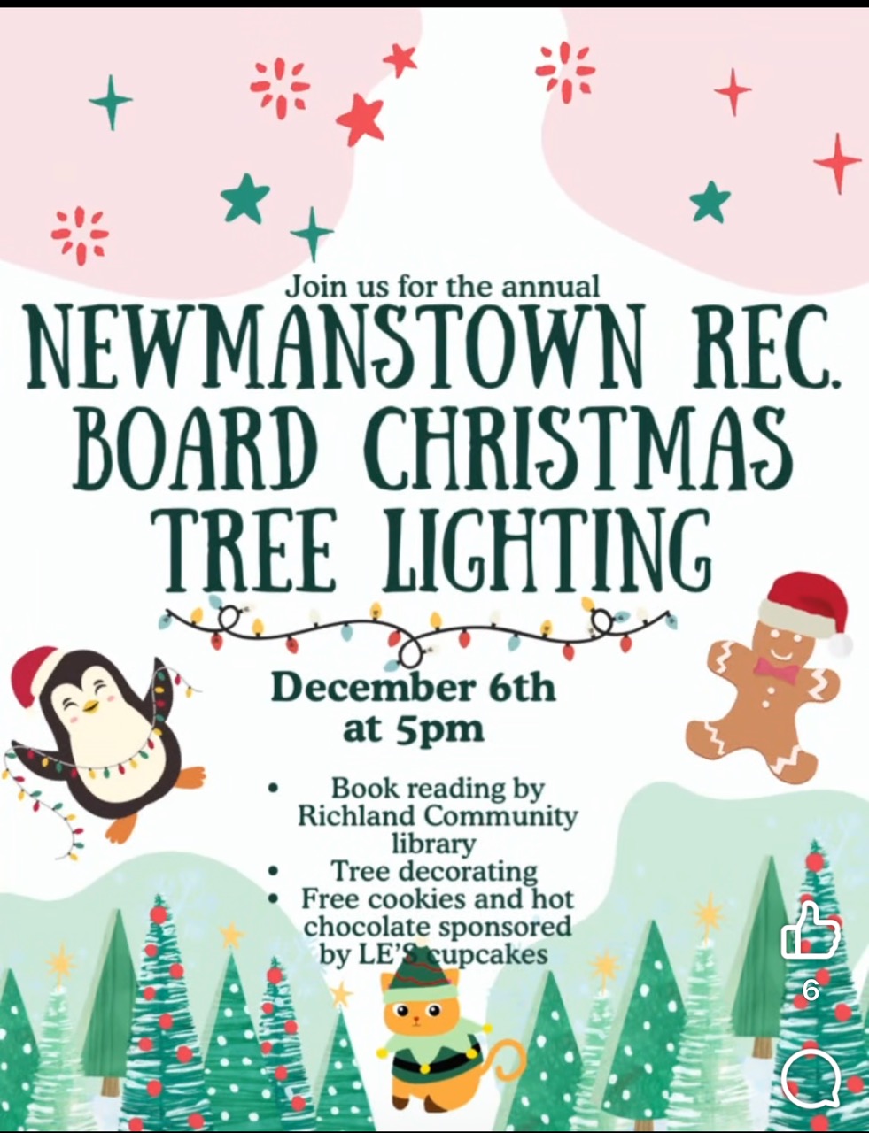 Come out and join the Newmanstown Recreation Board for a community tree lighting.  December 6th,  5pm at the Noel Hertzog Fields, White Swan Park.